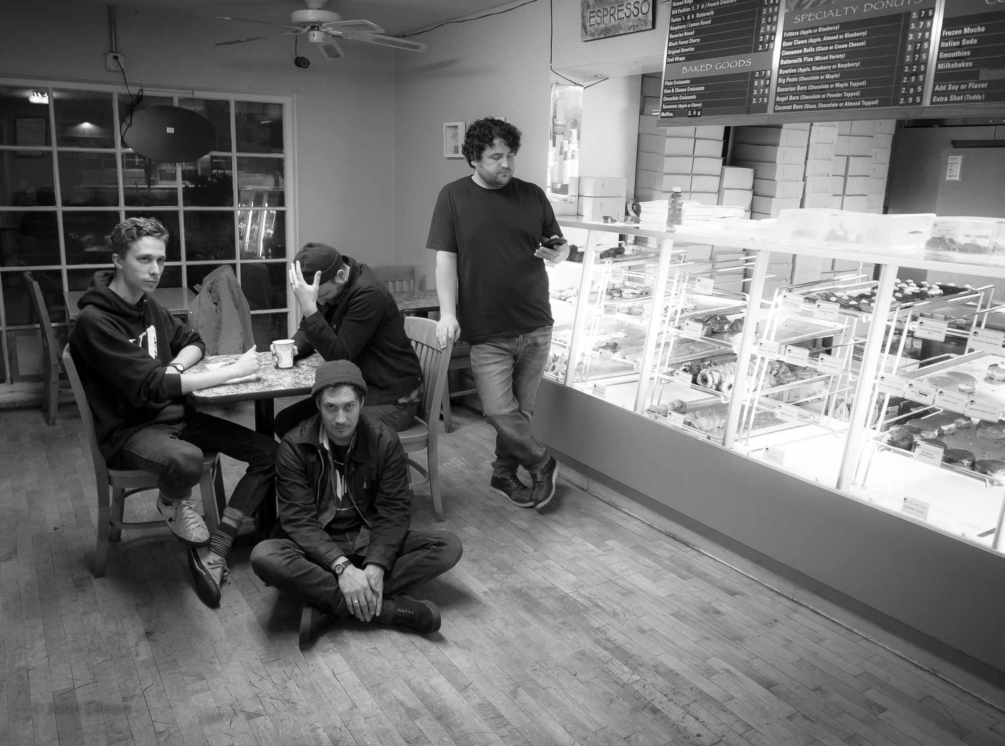The few band photos I’ve included here came from a photo shoot I did following one of those band-rehearsal evenings. After loading out their gear from their practice (which I also photographed), they drove across town to The Donut House, Anacortes’s 24-hour donut shop (featured in Buffet’s song, “DoHo”). The guys were tired. They kindly agreed to do the shoot, which lasted, maybe, 20 minutes. No other customers were in the shop so I could move the seating around as I liked. Then I shot super fast. I had planned this shoot in my imagination for over two years. Then, it was over. I captured a fleeting Buffet moment, like one of their songs, like this interview (which is mostly highlights). One fleeting moment in one band’s personal history. The few photos I got that evening, I think, will be classics for this band. I’ve heard talk of more demos being recorded for a second LP. But who knows how much time any of us has, or what we’ll do with it?