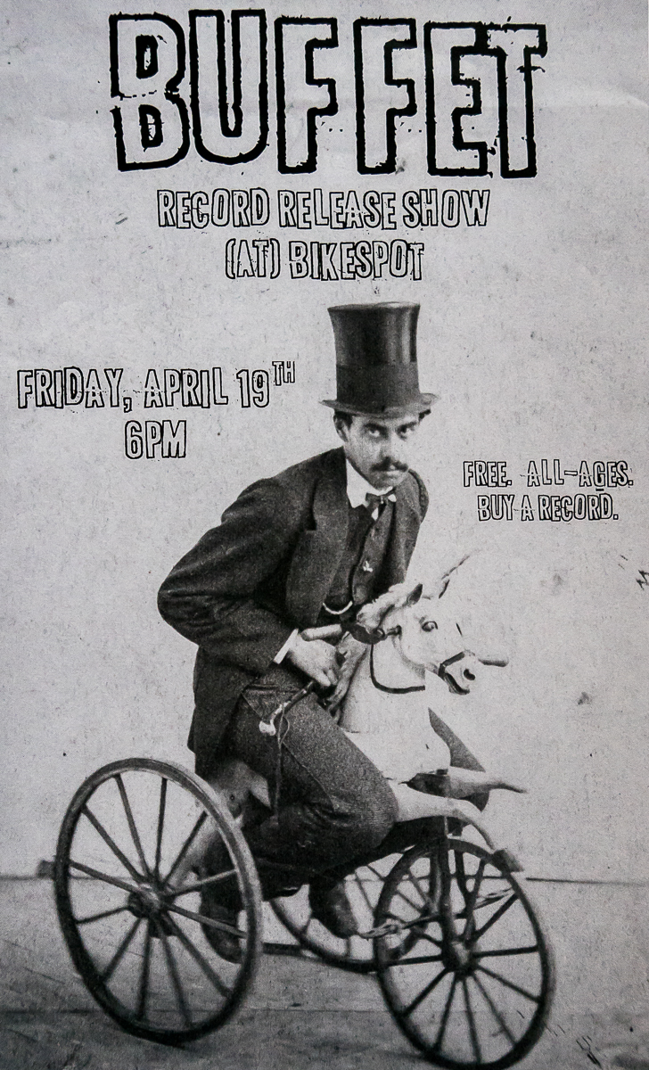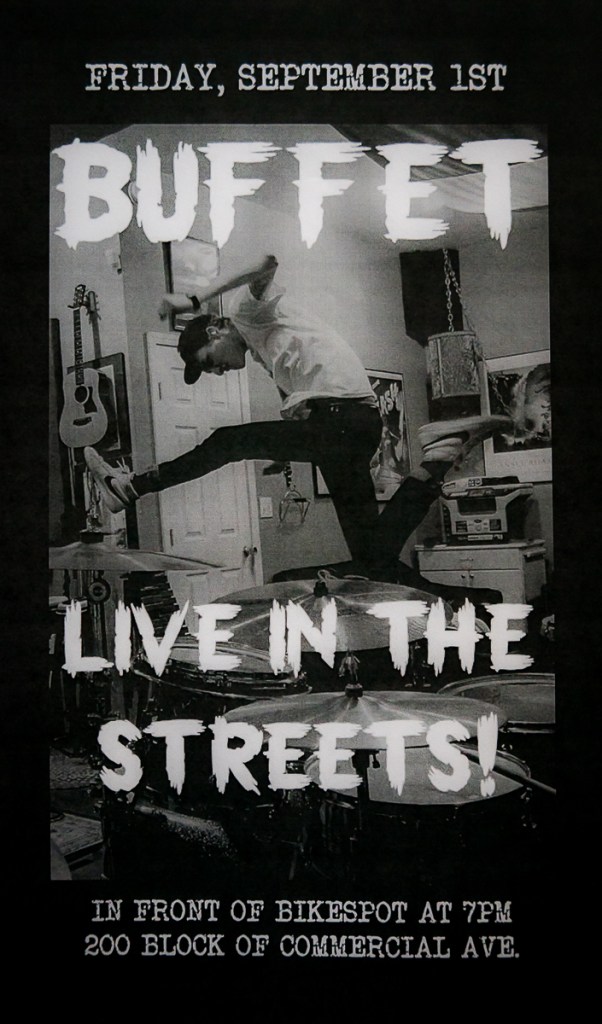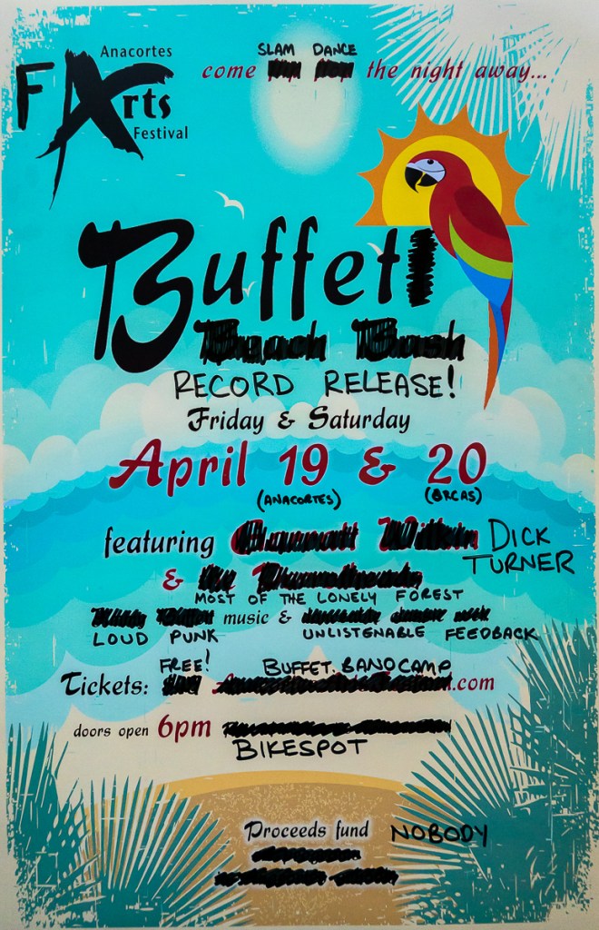 Part of what’s exciting, to me, about the possibilities that punk has, is putting yourself in an unlikely situation and shouting your message to people who don’t normally hear that. I don’t think we have any major political statement in Buffet. But,… even just the idea of playing on the street outside during the Anacortes Arts Festival, that was exciting to me… because it was like… “Oh, we’re going to make a bunch of people angry! We’re going to make them hear a weird thing they don’t think exists in our town.” As a member of a small subculture in our community, that’s more important to me. To get your message out. Or make people think, or jar them from their day-to-day existence.